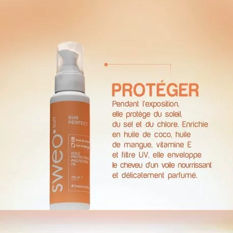 L’huile solaire protectrice Sweo.Sun Perfect protège efficacement les cheveux exposés au soleil, à la mer et au chlore. Sa formule vegan, enrichie en huile de coco, huile de mangue et vitamine E, nourrit la fibre capillaire tout en prévenant le dessèchement grâce à son filtre UV intégré.