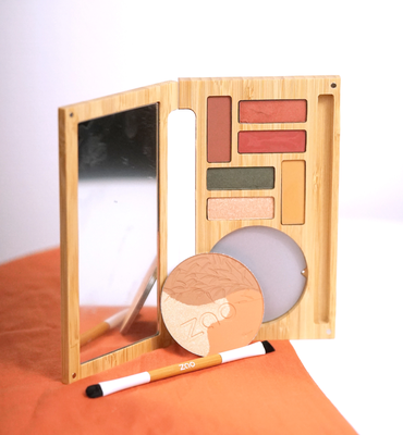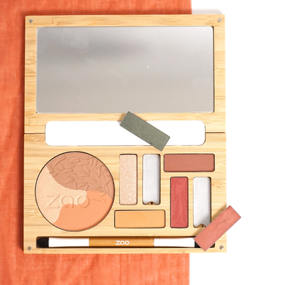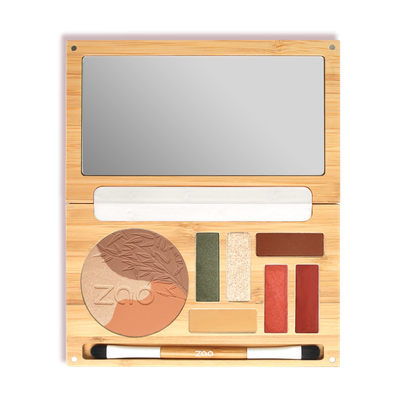 Palette maquillage naturel – palette tout-en-un – teint hâlé – fards à paupières pigmentés – rouge à lèvres crème – gloss terracotta – maquillage longue tenue – palette rechargeable bambou